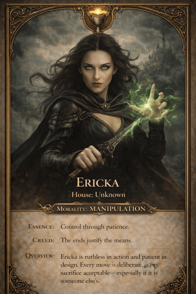 | Ericka | A stoic warrior with a dark past. | Wields a legendary sword. | Struggles with inner demons. |